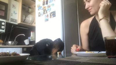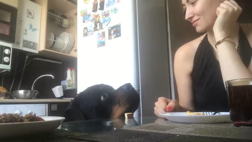 Pes se snaží sníst kousek dortu nad stolem. Ale jakmile majitel obrátí svůj pohled, činí ho lhostejným.