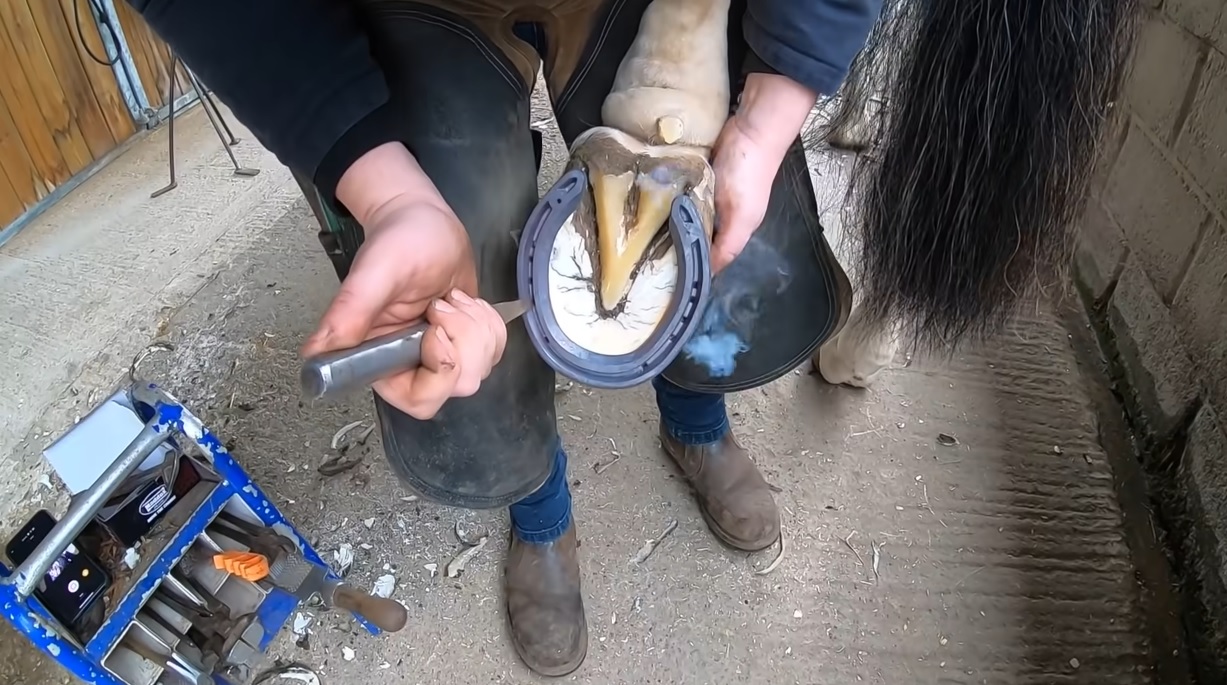 V Anglii, jezdec udržuje kopyta dospělého koně, a umisťuje nové okvětní lístky.