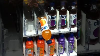 Skupině mladých lidí v Anglii se podaří získat dvě láhve nealkoholických nápojů, které uvízly v automatu, bít je třetí lahví.