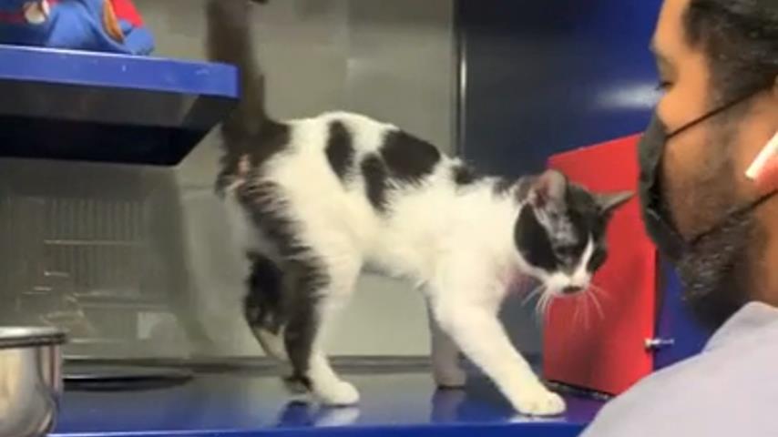 Na veterinární klinice, zdá se, že kotě chce adoptovat veterináře.