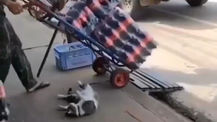 Kočka relaxuje vleže na chodníku, když zaměstnanec projde s vozíkem nealkoholických nápojů.