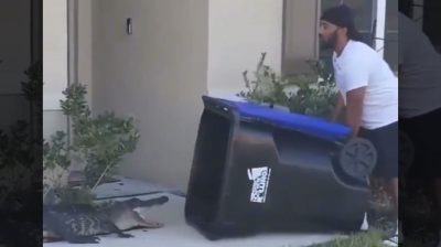 V US Floridě, muž pomocí odpadkového koše chytí mladého aligátora, který byl odstraněn ze svého přirozeného prostředí.