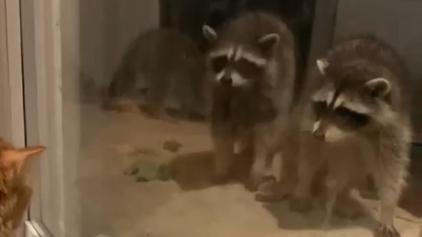 Vidět kočku, jak se na ně dívá z okna, rodina mývalů odchází z verandy domu, jako by se chtěla omluvit za rozrušení.