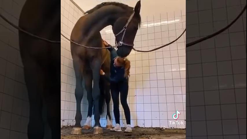 Kůň vypadá, jako by lechtal, když ho jeho majitel podřízne zastřihovačem na břiše.