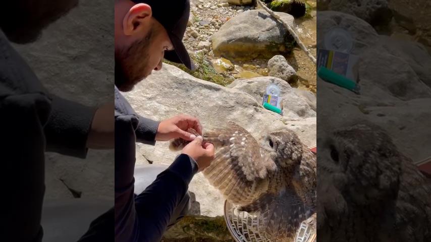 Muž pomáhá sově, která byla zapletená do vlasce, a visel ze stromu.