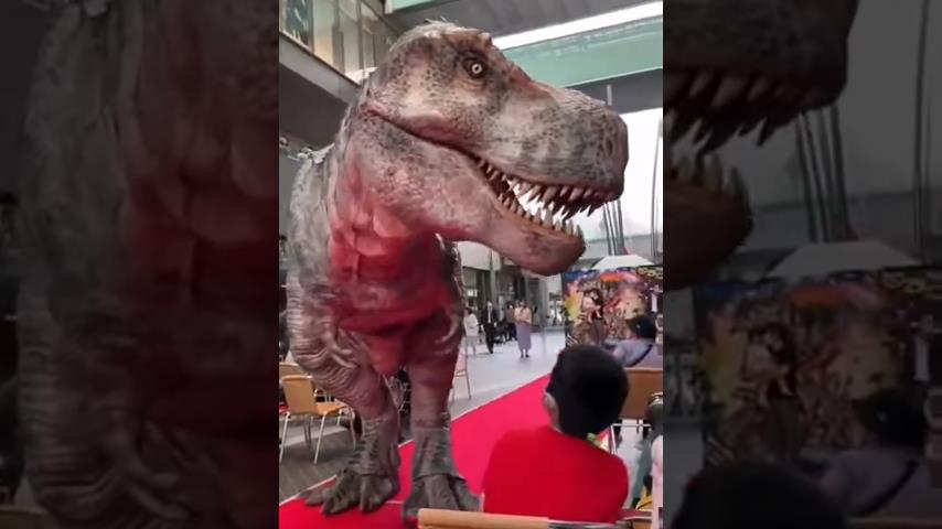 Realistický mechanický tyranosaurus vyrobený japonskou společností ON-Art, se prochází v obchoďáku a děsí návštěvníky.