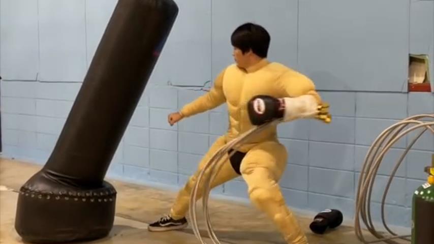 Japonský Youtuber Riku testuje sílu pěsti poháněné vysokotlakými vzduchovými lahvemi.