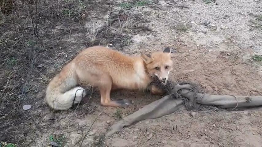 Kolemjdoucí na odlehlé venkovské silnici v Rusku, pomozte lišce, která se zamotala do starého kusu látky.