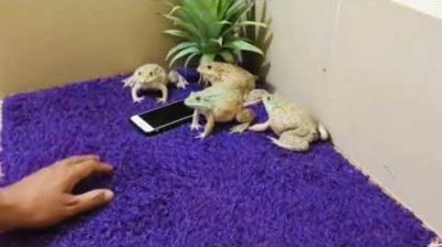Žáby skřípou, když se jedna ruka přiblíží, aby popadla mobilní telefon.