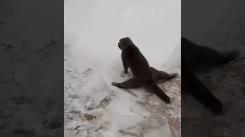 Kočka chce jít na procházku do sněhu, ale neustále klouže po zledovatělém povrchu.