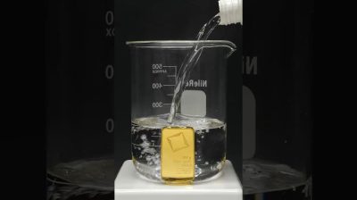 Muž rozpustí zlatý slitek za 5 700 dolarů ve sklenici plné kyseliny chlorovodíkové. Operace je naštěstí reverzibilní, a může získat zlato zpět z roztoku v banku... Toto je falešné video vytvořené uživatelem NileRed.