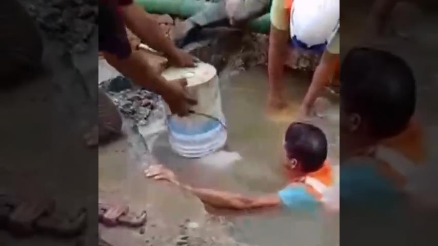 Dělník pracuje pod vodou, brát kyslík z kbelíku, který kolega drží nad hlavou.