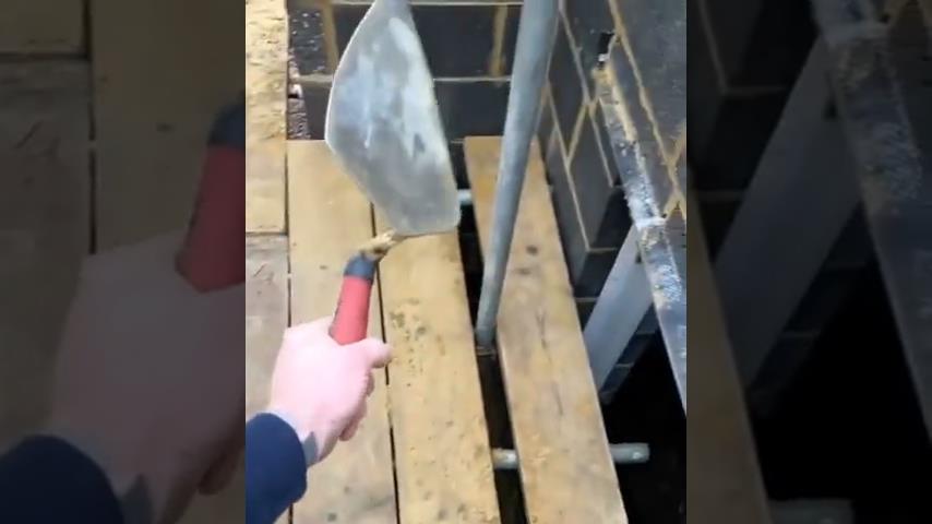 Dělník působivě zvedá nohou hladítko, a pak to přibije na desku lešení.