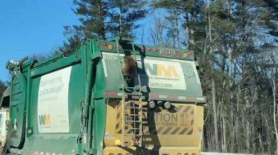 Mýval sedí na žebříku v zadní části popelářského vozu, která vede na silnici poblíž Londonderry ve Spojených státech. Motoristé zalarmovali řidiče popelářského vozu, a poté zastavil, aby umožnil zvířeti vystoupit z vozidla.