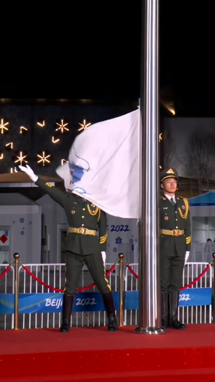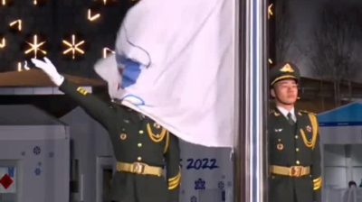 Čínský voják zůstává nezklamaný, když během předávání medailí ve skiatlonu na olympijských hrách v Pekingu vezme vlajku do obličeje.