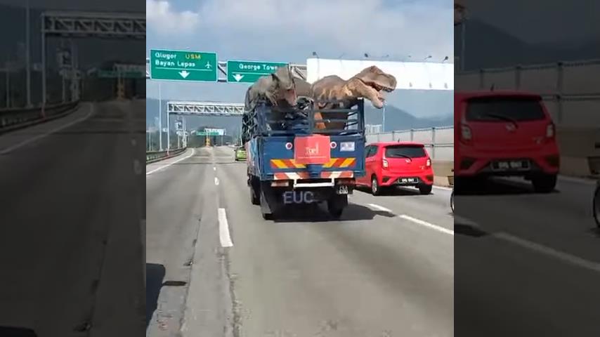 Dva dinosauři cestují na náklaďáku, na dálnici v Malajsii. Toto je reklama na The Top Penang Dinosaur Theme Park, v Pulau Pinang, Malajsie.