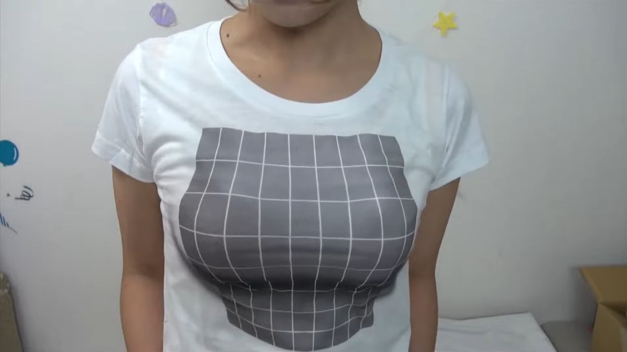Žena nosí tričko, které budí iluzi, že má velká prsa.