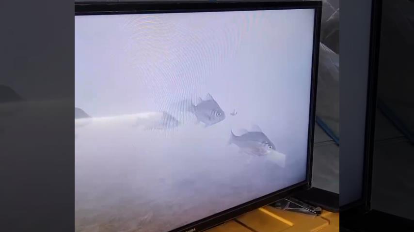 S pomocí podvodní kamery, rybář chytá rybu pod ledem.