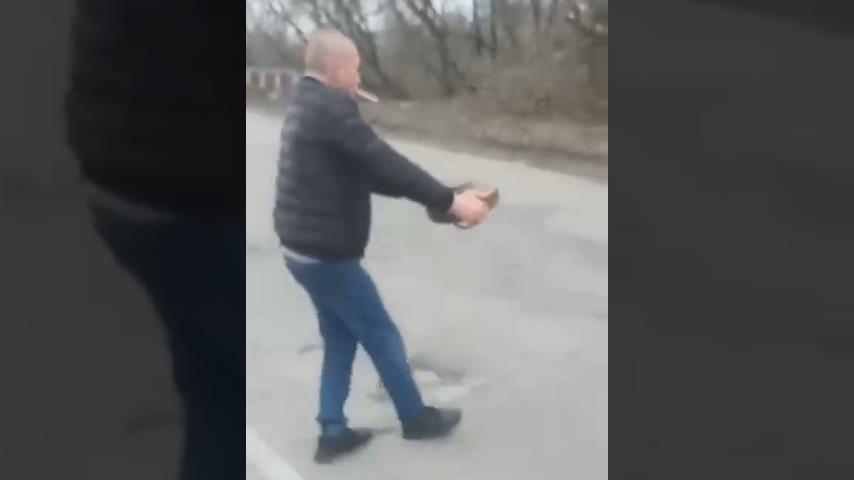 Ukrajinec v Berdjansku odstraňuje minu do lesa, kterou našel pod mostem.
