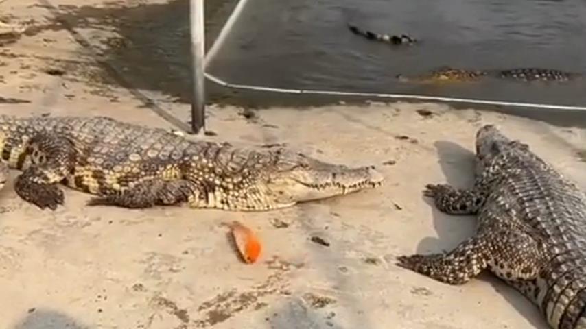 Ve scéně, která vypadá jako vystřižená z karikatury, krokodýl se snaží chytit rybu, kterou mu někdo hodil do krunýře.