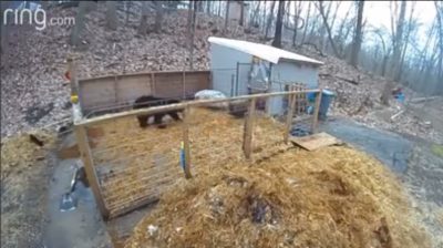 Hladový medvěd vstoupí do ohrady dvou prasat, ale statečné prase má.