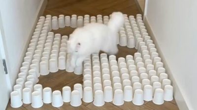Kočka musí překonávat různé překážky z papírových kelímků a kousků kartonu.