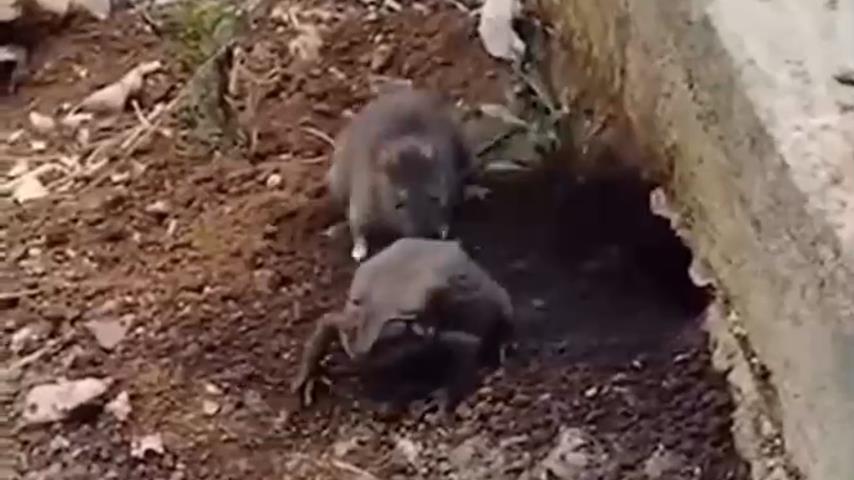 Krysa čelí žábě, který našel útočiště ve svém hnízdě.