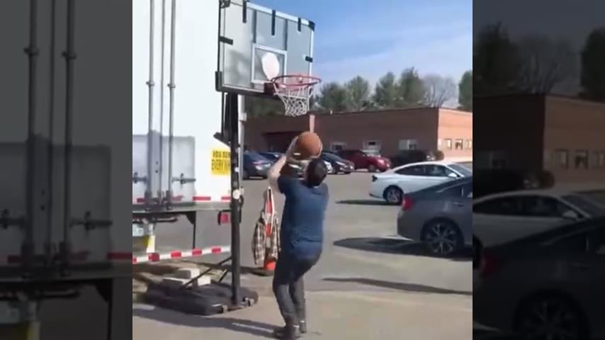Muž se snaží přibít míček na velmi nízký koš, ale selže bídně.