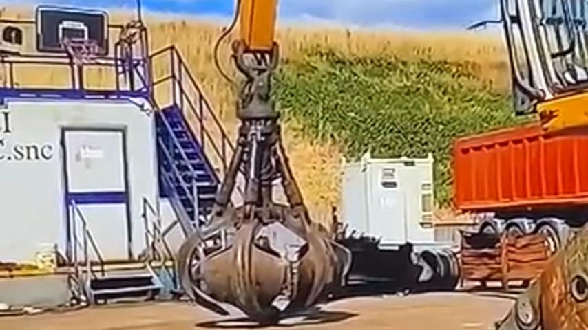 Jeřábník hraje basketbal tak, že skóruje dva koše v řadě obrovským třmenem svého stroje.