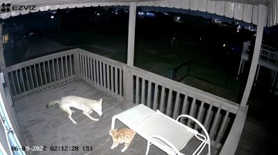 Na verandě domu v Surfside Beach v Texasu, kojot napadne kočku. Kočce se nakonec podaří uniknout kojotovi tím, že vyšplhá na vrchol trámu.