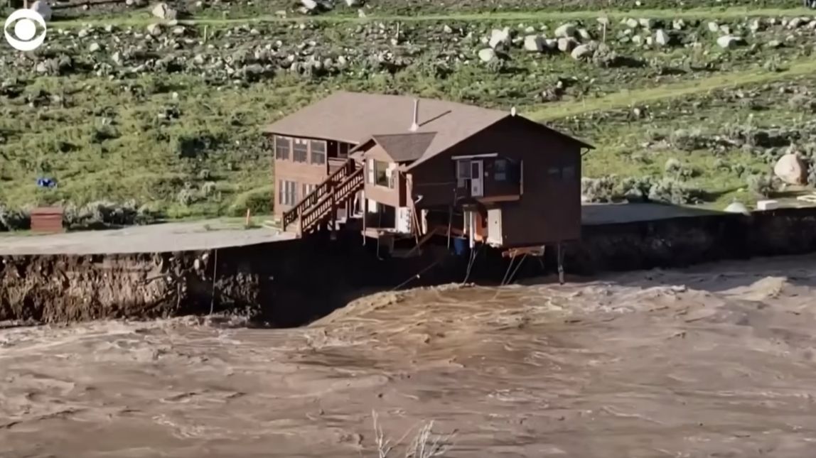 Obrovská povodeň řeky Yellowstone, která začala 14. června 2022, táhne dřevěný dům k řece.