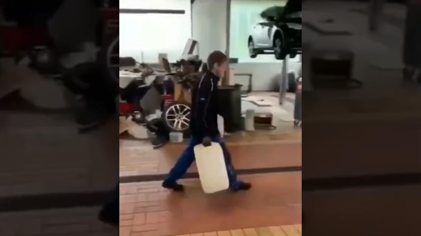 Muž ukazuje svůj talent v pantomimě, když pracuje v dílně.