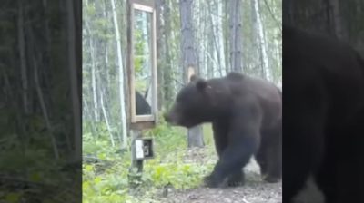 Medvěd je rozzuřený, když vidí svůj odraz v zrcadle instalovaném v lese.