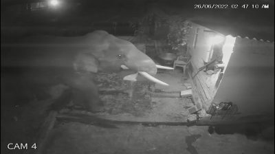 Večer ve vesnici v jižní Indii, hladový slon ničí přední část domu, hledá jídlo v kuchyni svým sosákem.