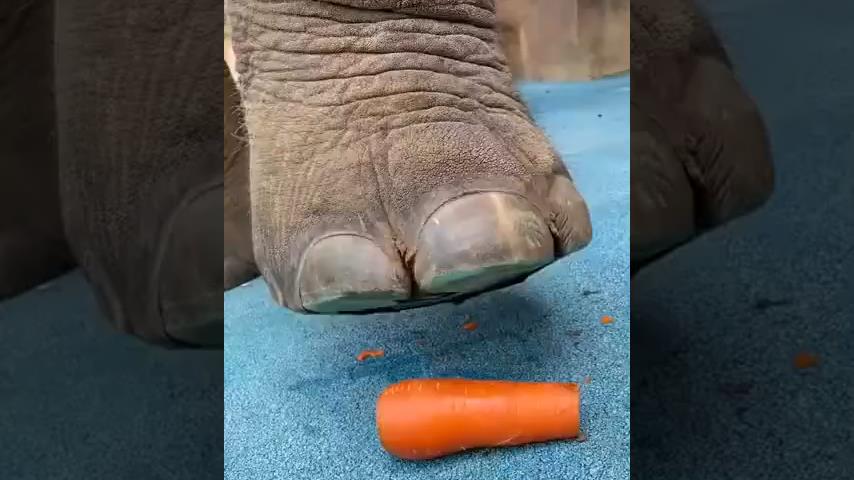 Slon preferuje svou mrkev nakrájenou na kousky, a proto je před jídlem krájí svou obrovskou nohou.