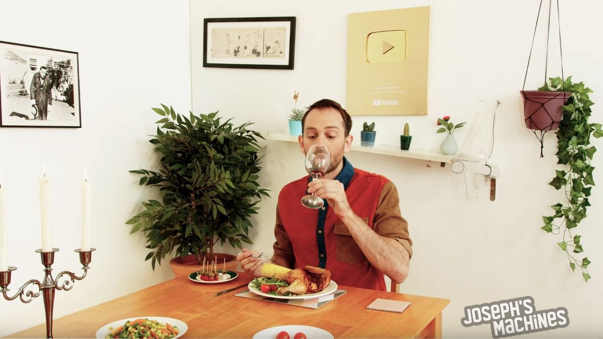Jak podat víno někomu na druhém konci dlouhého stolu, aniž bys vstal. Velmi vtipný stroj Rube Goldberg od Josepha Herschera.