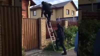 Speciální policejní jednotky v Rusku provedly razii v domě podezřelého drogového dealera, a snaží se dostat přes plot pomocí žebříku. Pak jim přijde na pomoc soused.