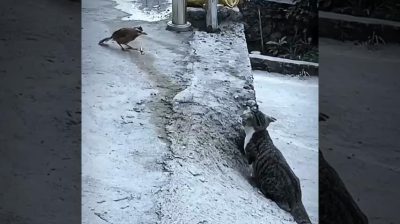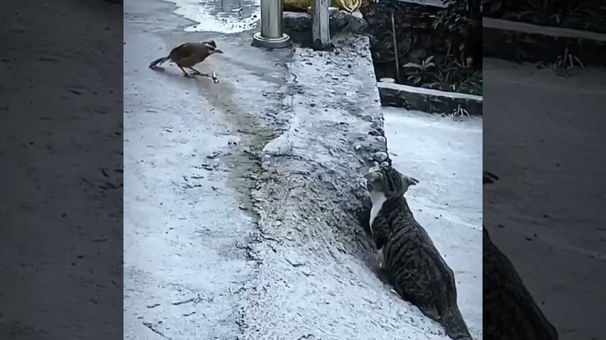 Kotě číhá a snaží se zaútočit na ptáka, ale lekne se, když se pták přiblíží na dýchací vzdálenost.