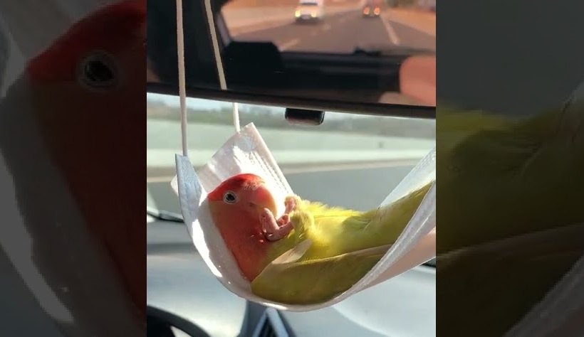 Papoušek leží na lékařské masce, která se promění v houpací síť, když visí ze zrcátka auta.