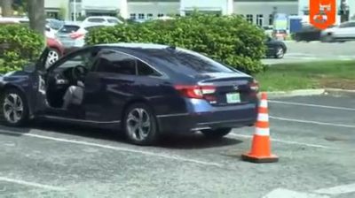 Žert s kuželem na dálkové ovládání, která brání řidiči opustit parkoviště.