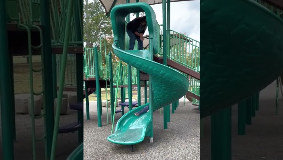 Statická elektřina způsobuje, že malému chlapci vstávají vlasy na hlavě, když sjíždí po točící se skluzavce.