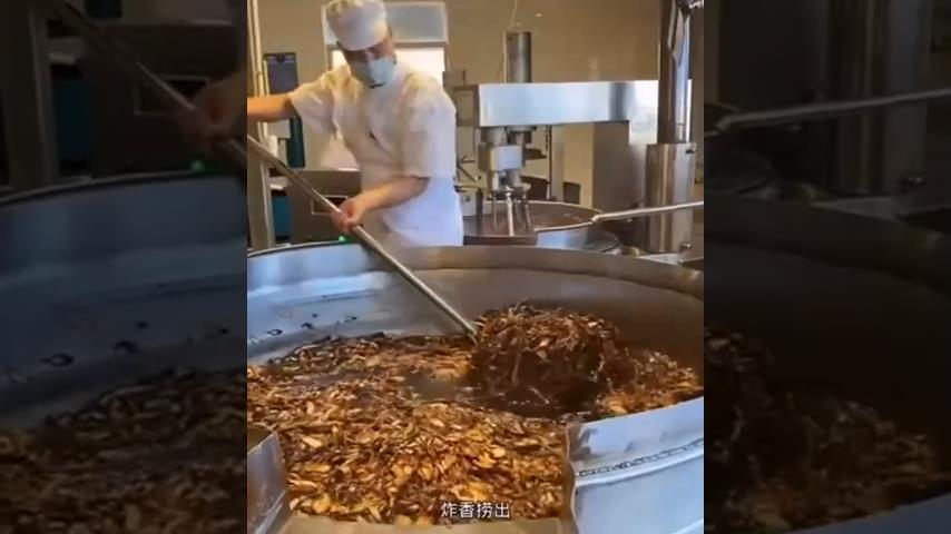 Hromadná výroba pálivé omáčky na dušená masa v továrně v Číně.