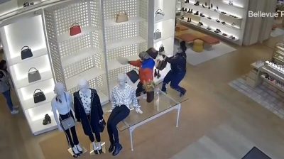 Zloděj vrazil hlavou napřed do okna při útěku z obchodu Louis Vuitton v Bellevue, Washington.