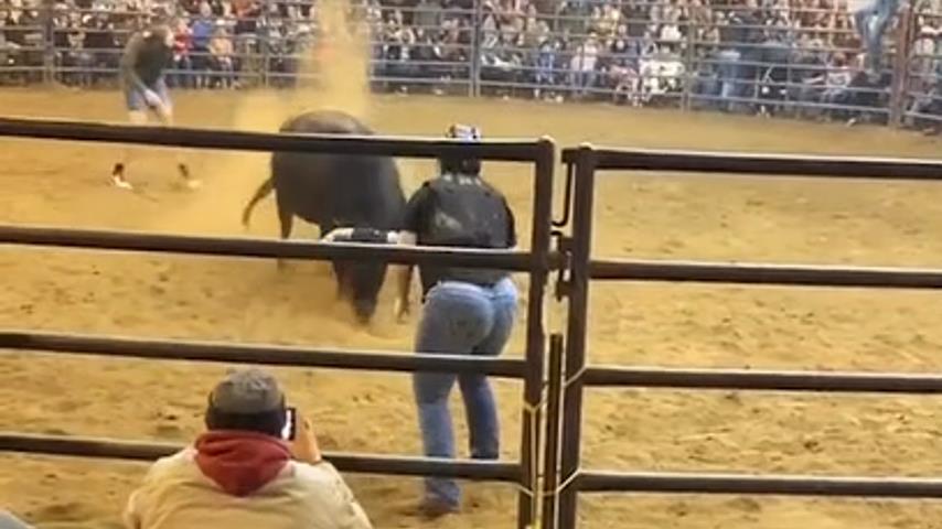 V rodeo aréně ve Spojených státech, žena se snaží nasednout na býka. Býk se k ní ale rychle otočí a vrhne ji po hlavě do zábradlí.