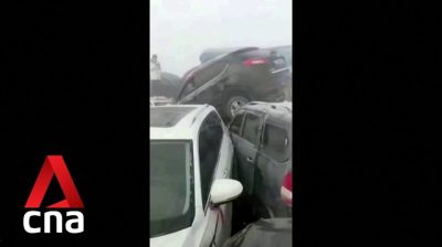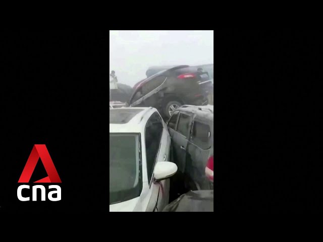 Hromadění na mostě v čínském městě Zhengzhou kvůli husté mlze.
