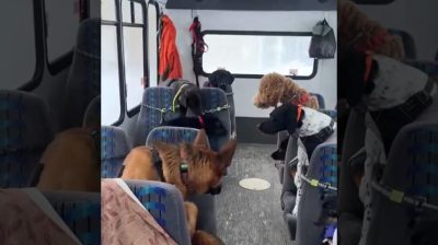 Ve městě Skagway na Aljašce, středisko výcviku a péče o psy 'Mo Mountain Mutts' každé ráno sváží psy z jejich domovů malým autobusem.