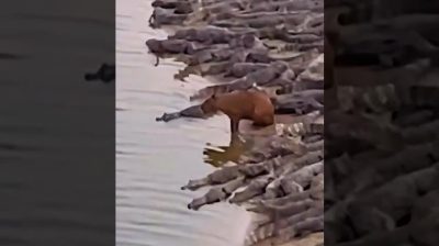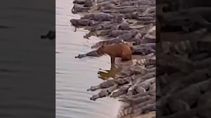 Mezi stovkami krokodýlů se nerušeně pohybuje kapybara.