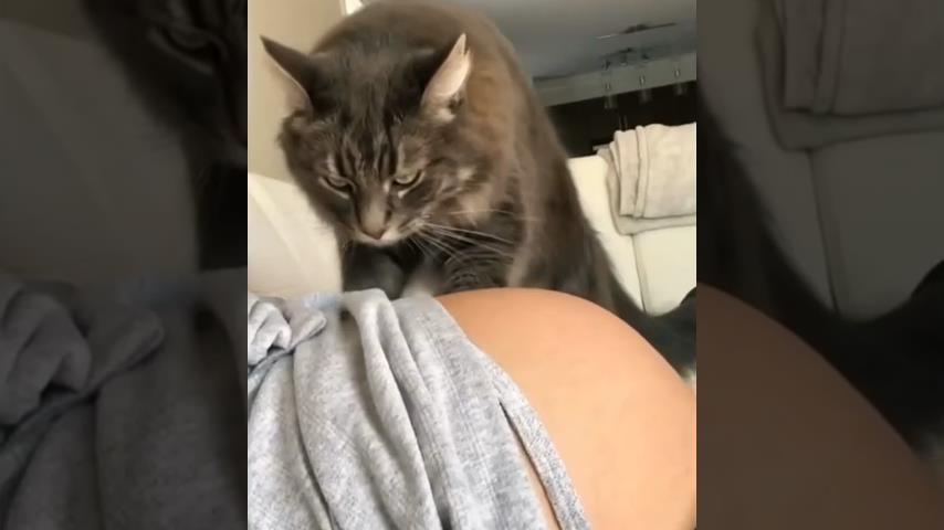 Kočka, která je často zvědavá a ráda leží své březí majitelce na břiše, konečně poznává nového člena rodiny.