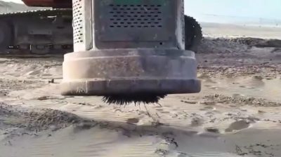 Kemp na pláži je vyčištěn od hřebíků a šroubů pomocí silného elektromagnetu.