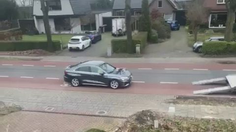 V Nizozemsku, muž nahrává na video ve chvíli, kdy je vyloženo nové Audi jeho souseda. Přepravník vyloží auto z přívěsu, a pak pokračuje k parkování na ulici. Jenže v tu chvíli kolem projede motorka, a padne na nové auto.